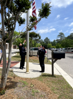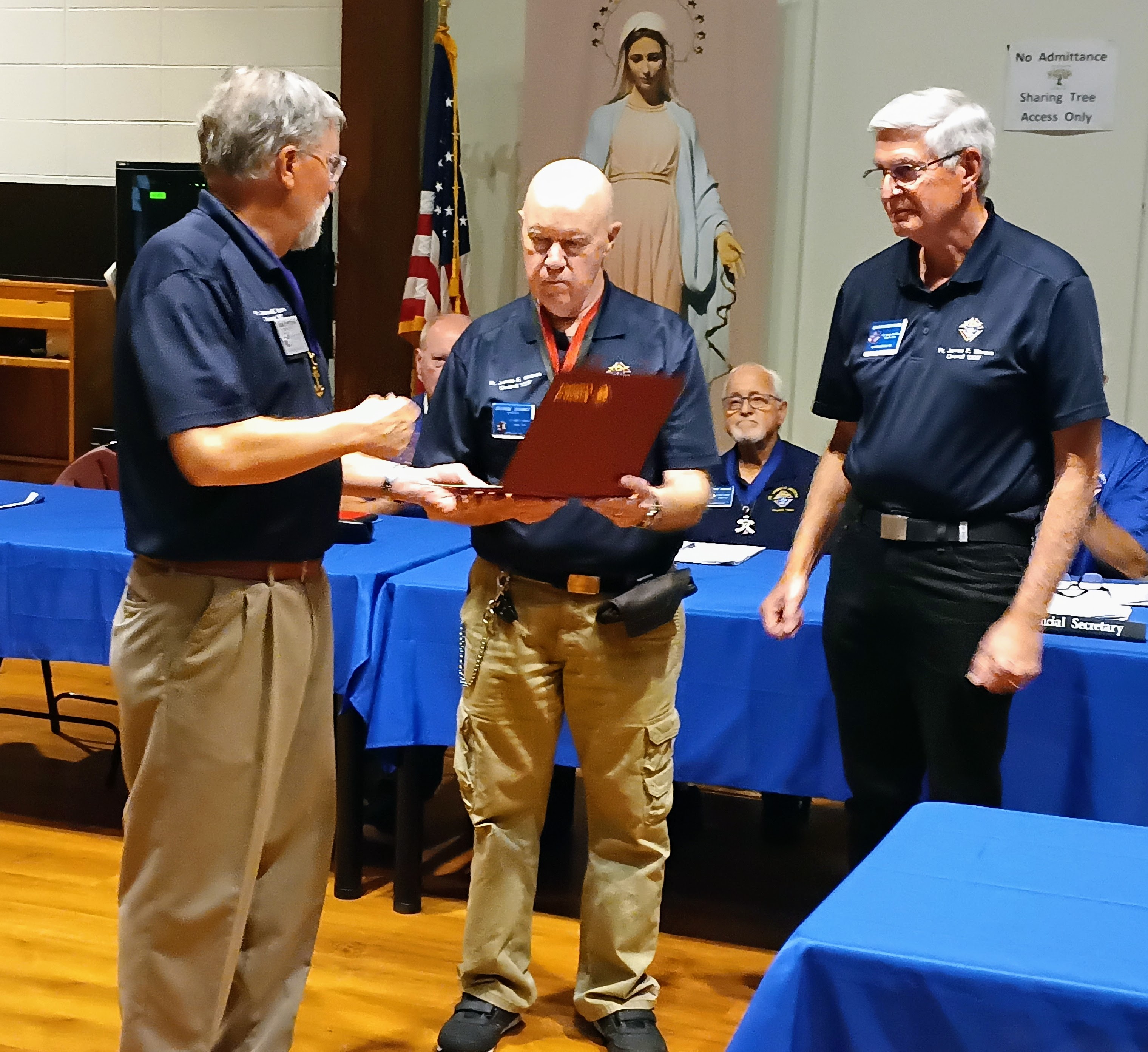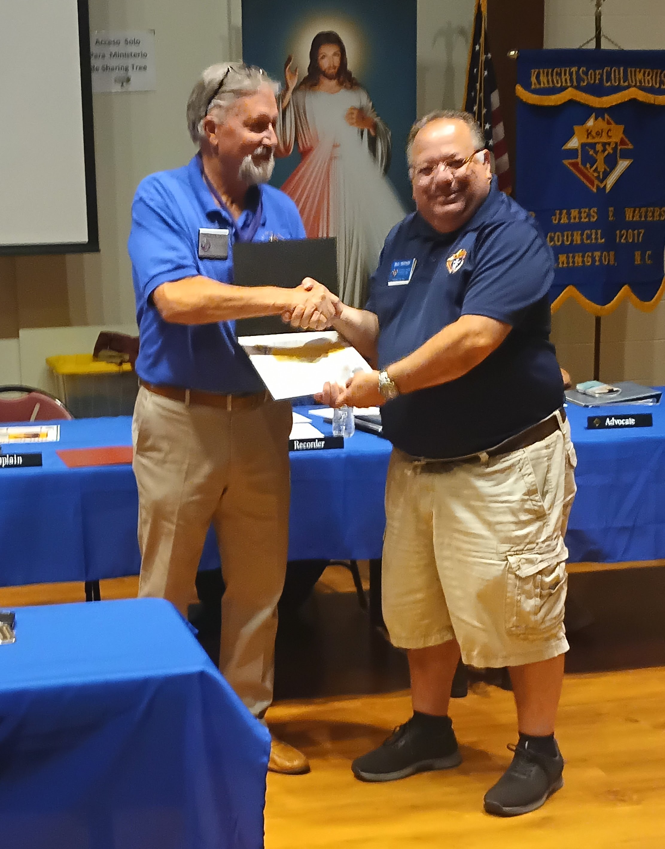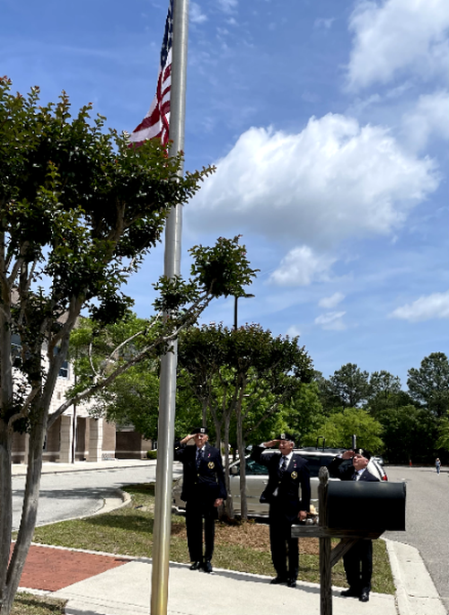 The Fourth Degree Assembly was asked to raise the flag for the opening ceremony of the St. Mark Family Picnic. It was a breezy day and we needed to lower the flag to half-staff in recognition of Pope Francis' death. Doing the honors were Past Faithful Navigators Bobby Philips and Greg Decker and current Captain Larry Greer.